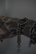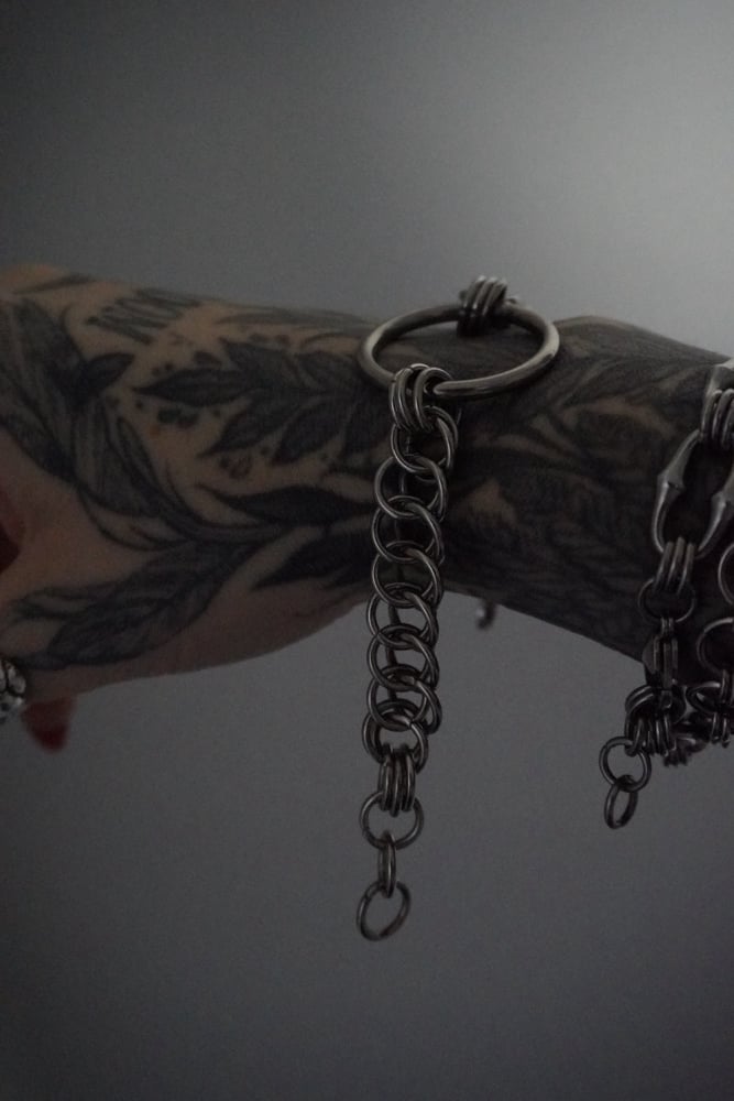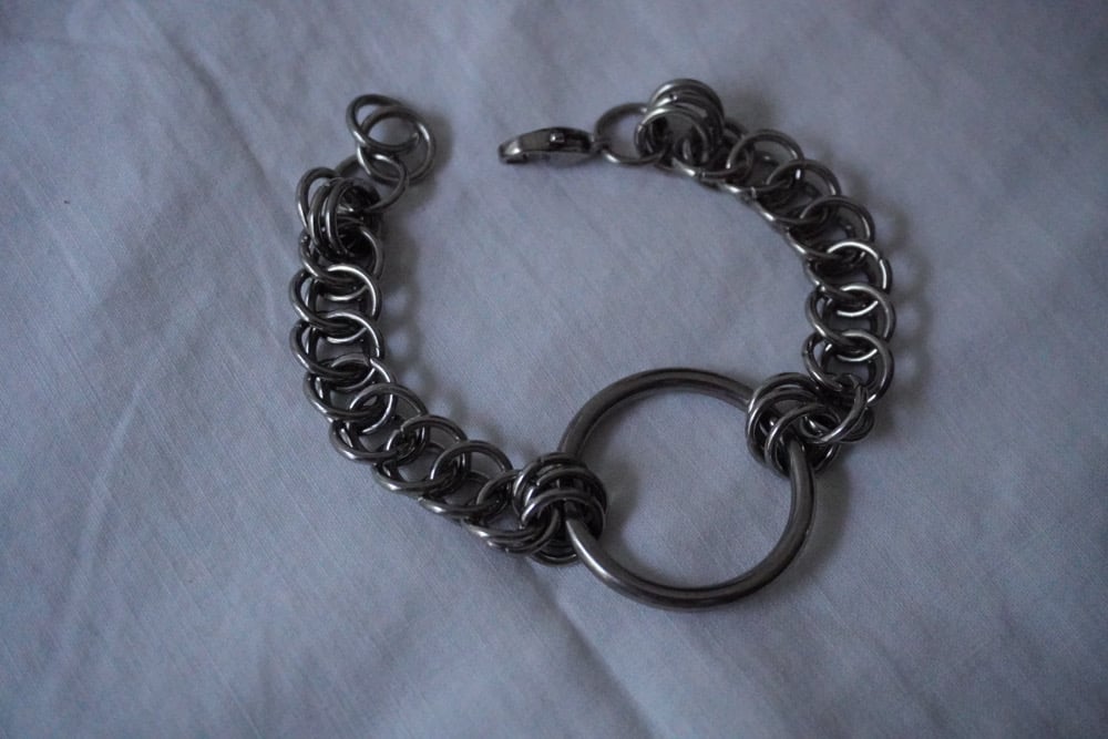 Hand made using stainless steel rings and weaved into a large chain made using the half Persian chainmail weave and featuring a large central O ring.